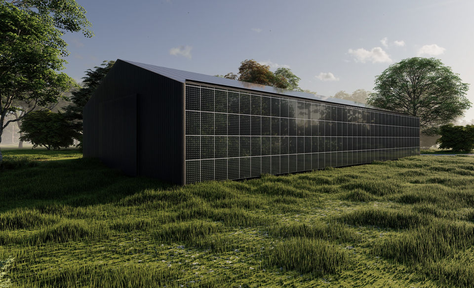 — Our approach with the Solar Barn was to establish parameters on our views and implementation of large equipment buildings and how they can be experienced. These industrial structures with large roof lines, provide an opportunity for aesthetic amplification, while pragmatically establishing sustainability and self efficiency. In collaboration with [ LIPS ] The 187 panel façade is strategically placed on the south facing exterior, to act as a second skin for solar production for the building and its day-to-day operations. Re-imagining industrial structures can set a new dialogue for sustainability and power all while honoring there surrounding environments. The solar panels are low-profile and durable — quietly converting sunlight to energy for the farms expansive fields. Integrated hardware and simple design aesthetic secure the panels close to the equipment buildings roof for a minimalist aesthetic.